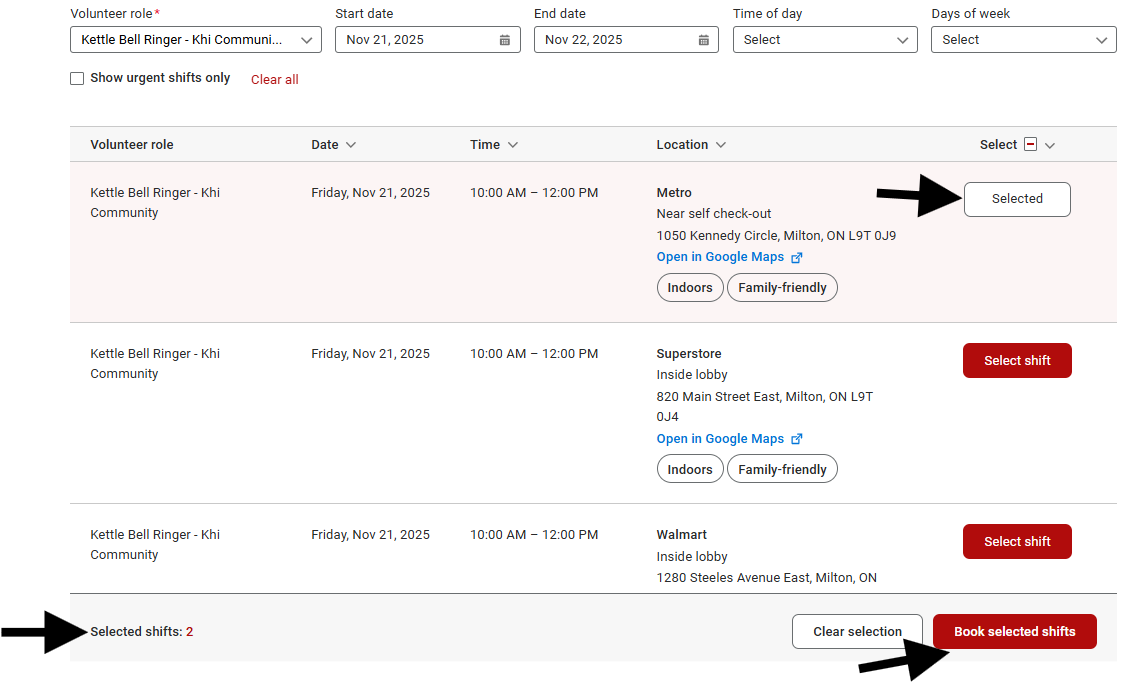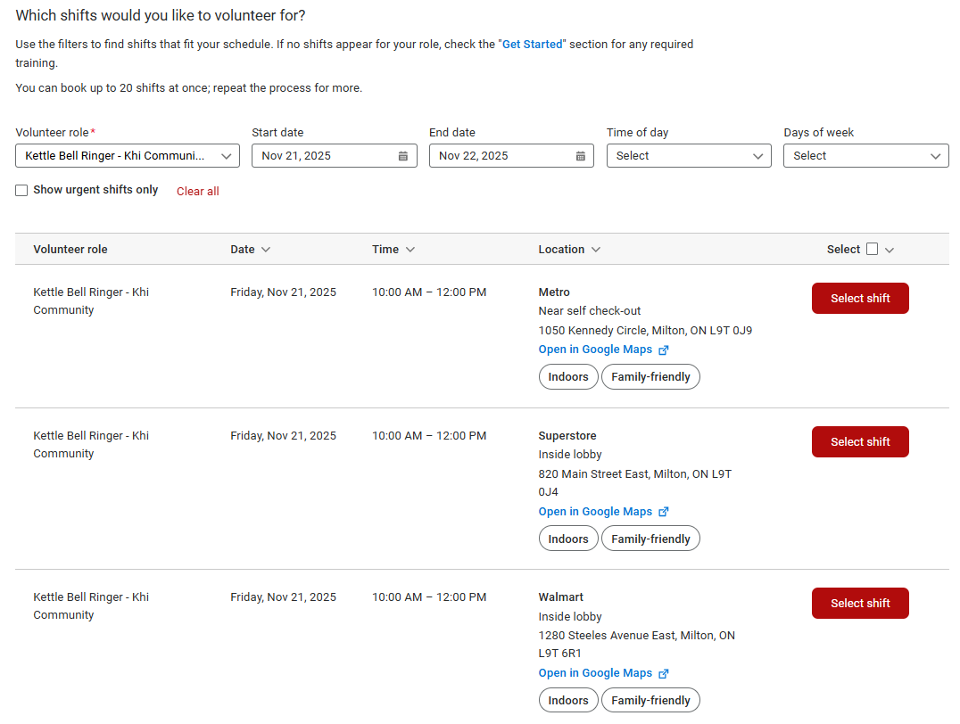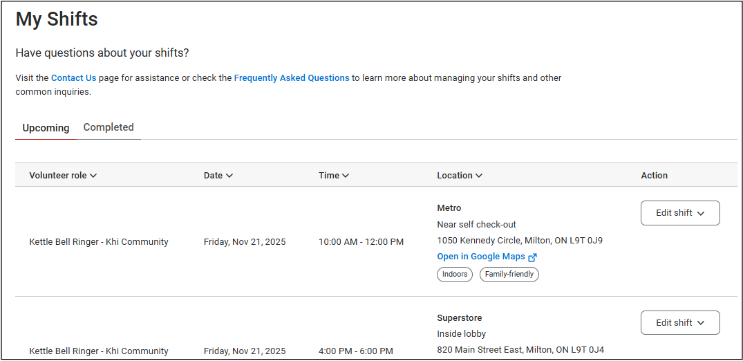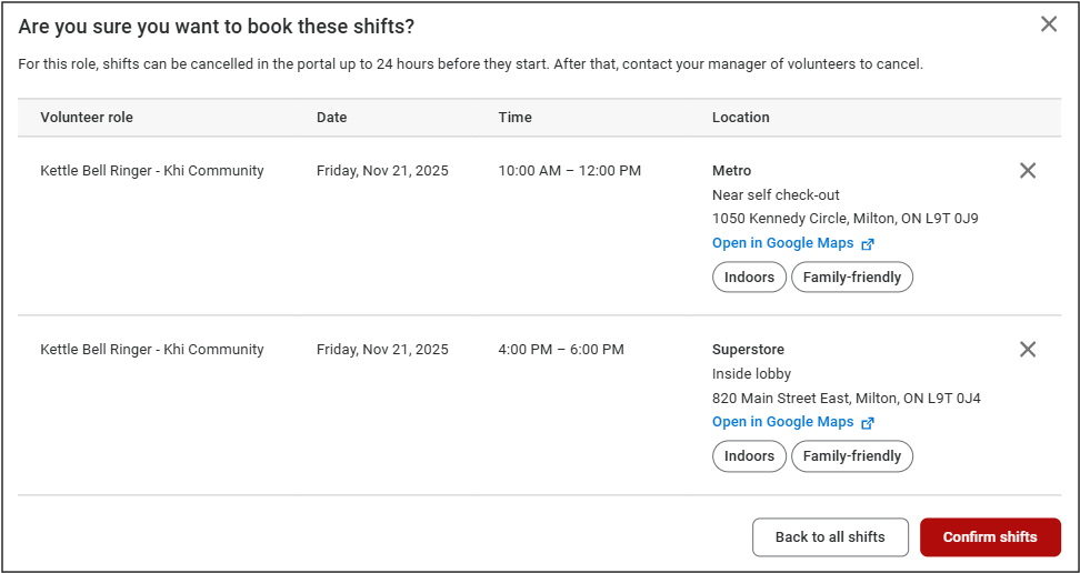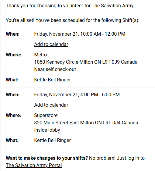 You will receive an email "You're Scheduled to Volunteer!" to confirm your booked kettle shifts. Example screen shot below.