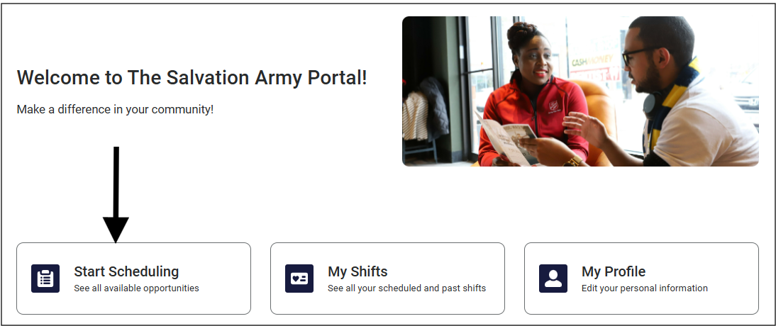 Login. Look for available shifts. Click on "Start Scheduling". Example screen shot below.